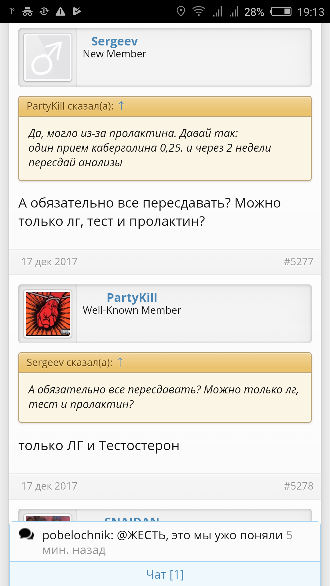 Да, все равно сдай на всякий случайХорошо, сдам анализы 8 января. Пролактин имеет смысл сдавать, учитывая, что я закинулся 0,25 мг кабера 26 декабря?