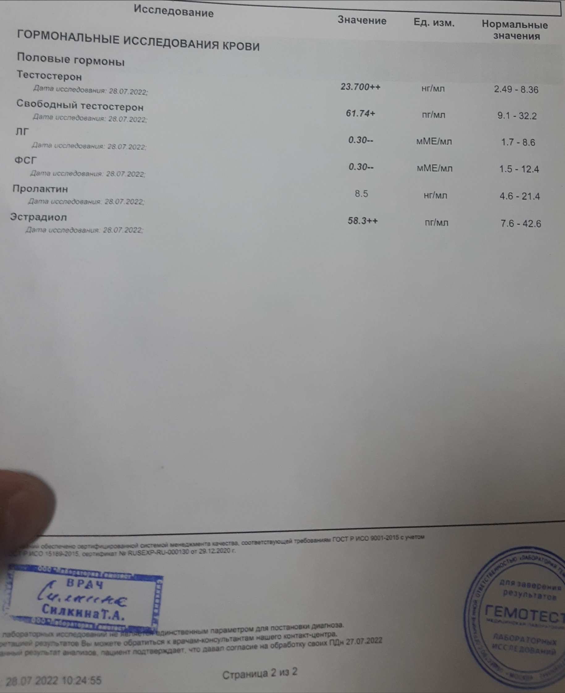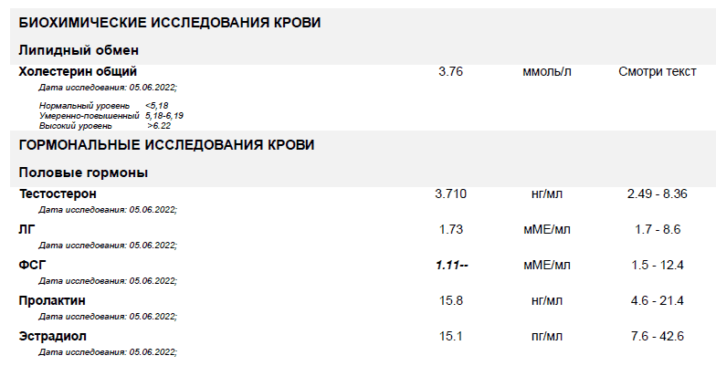 Курсец был долгий, затяжной, на дэке, с мостом и последующей сушкой. ПКТ провёл не до конца, вылезла сильнейшая аллергия не понятно на что, пришлось вообще всё убирать. Анализы сдал спустя 1.5 месяца после последней таблетки кломифена. Видно что никуя не восстановился до рефов.