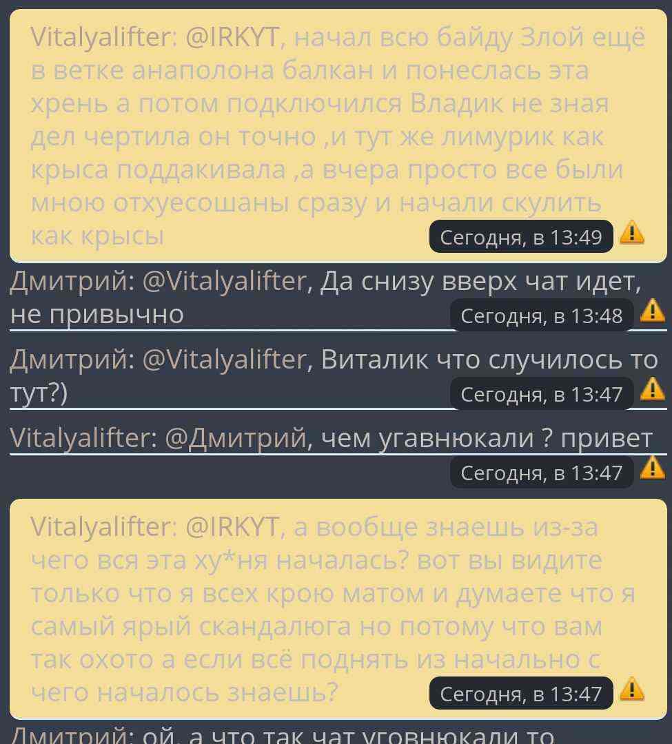 @Vitalyalifter Слышь стукачок, одно дело когда ты в общий чат пишешь всякую мне хрень, я ее воспринимаю как просто шуточки, другое дело ты в личку парням называешь крысой... Обоснуй свои слова...если не обоснуешь, то предлагаю руководству форума забанить тебя на месяцок, может после этого поумнеешь... Думай своей бошкой лучше и смотри где грань