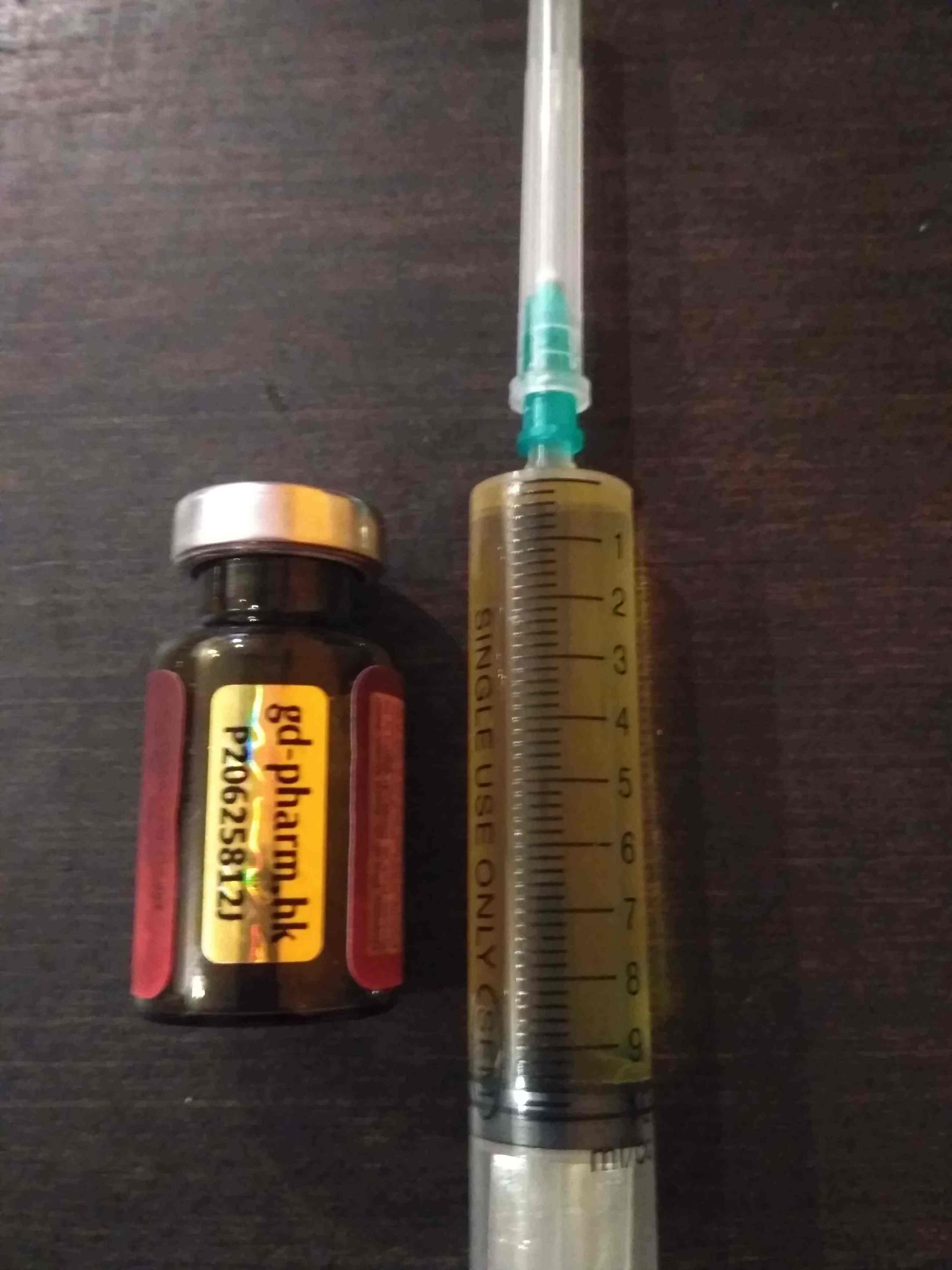 Недолив?Всем привет! Не дождался я 1 апреля и влупил первую инъекцию сегодня. Замес как и писал, куб суста + куб трена. Ставил в бедро, попал криво, кровищи как со свиньи, но ни какого кашля или чего-то подобного не было. Масло грел, очень жиденькое, набирается в шприц как вода. Набрал содержимое виалы в 10 кубовый шприц, выжал все до капли, фото ниже.