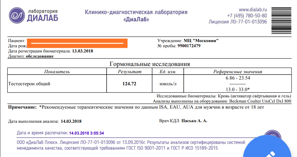 По анализам тестостерон общий 124.72 нмоль/л