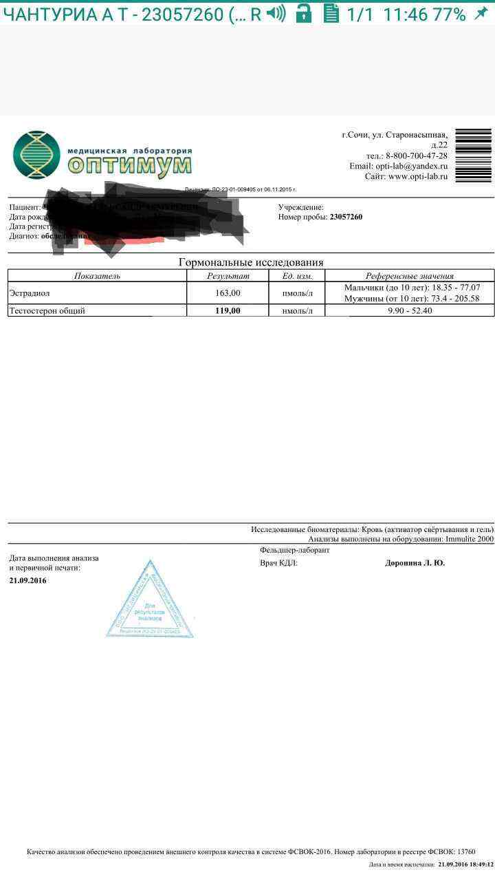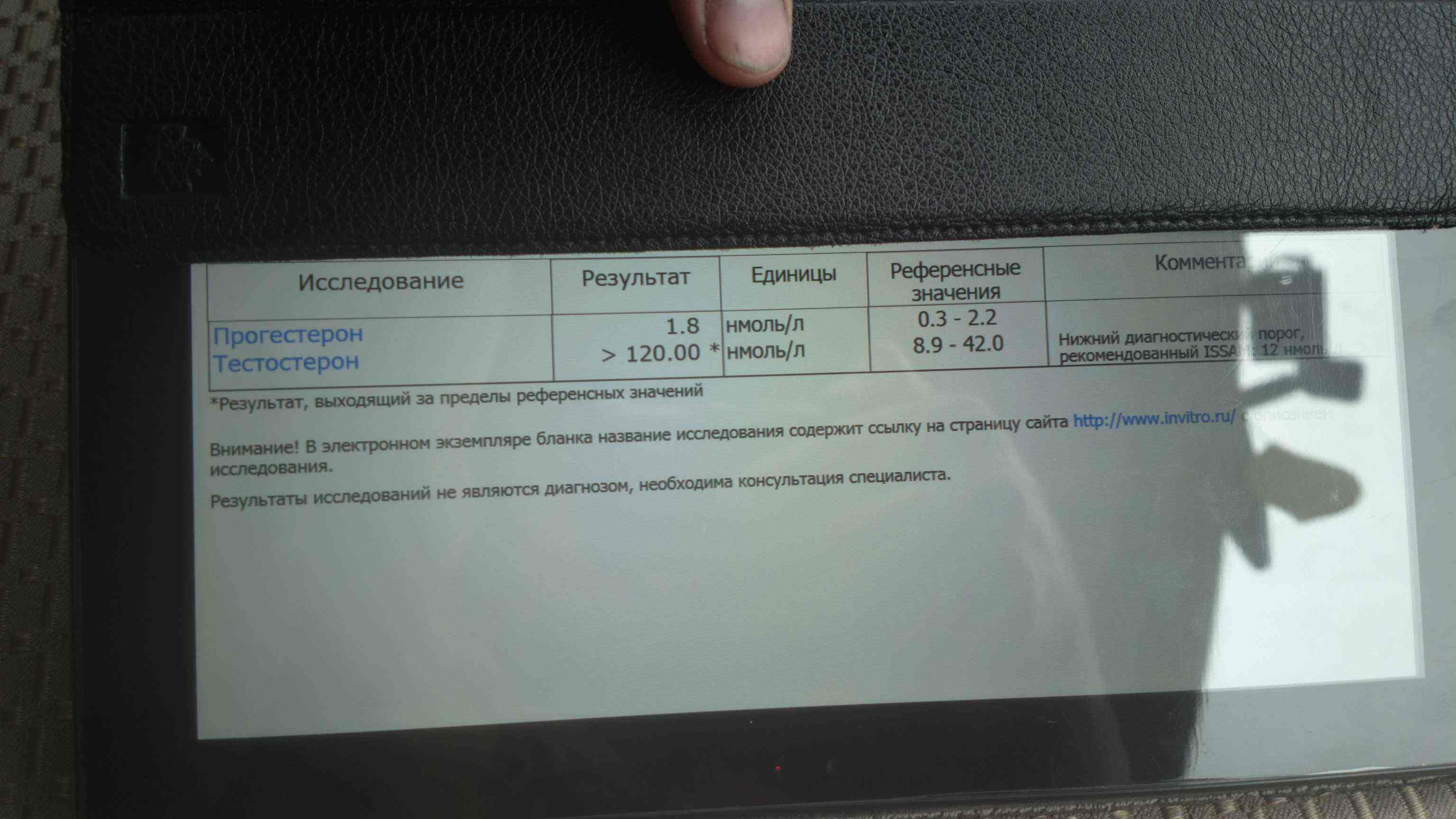 Всем привет. Ден тебе в особенности. Сделал 6-инжектов ТЕСТЕН 250, каждый по 250. первые два были пн, чт, еще четыре делал через каждые три дня. Анализы прилагаю. По верхнему референсу, превышение в 6 раз!!! Результат считаю достойным. Сейчас перехожу на схему (TESTEN 750+BOLDEN 900)/нед. Ставить буду 1,3,5 день. Думаю 12-15 верхних покажет, может и больше. Это по объективу. По субъективу, масло мягкое, и безболезненное(как и писал раньше), по внешним признакам злой как собака. ДЕН, ПРЕПАРАТ TESTEN 250(Серия 004-е) РАБОЧИЙ 100%