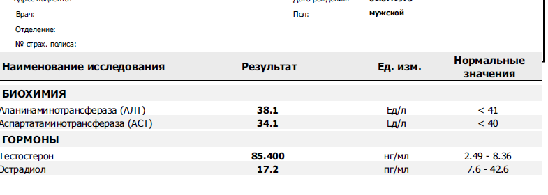 ребята посмотрите анализ. делал первый раз. Ставлю тестен 400 в неделю. Вес 80кг. на курсе 5-й месяц. Именно TESTEN 3 иньекции. После 3-й иньекции на 4-й день была сделан анализ.