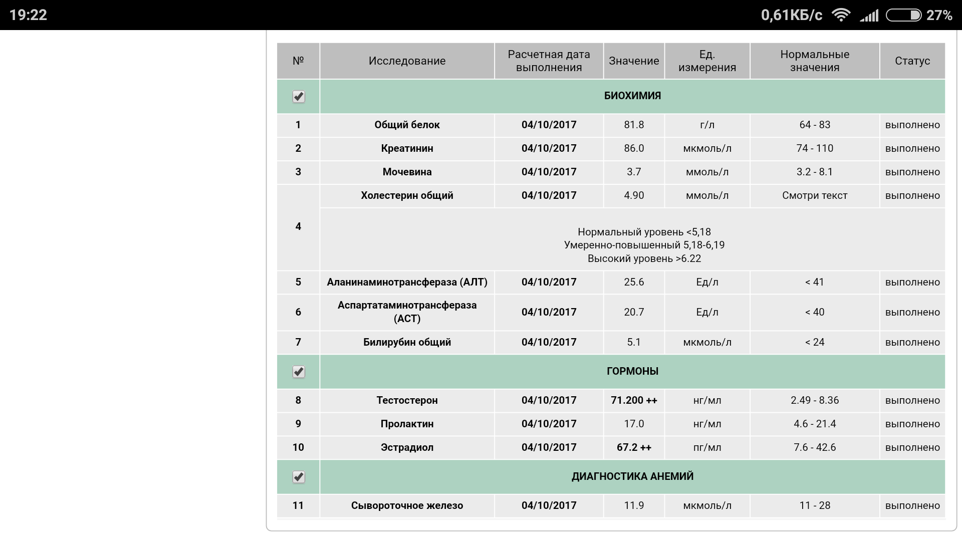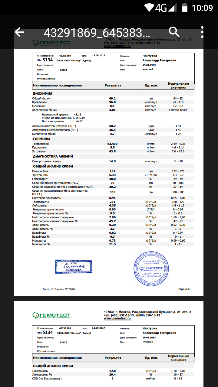 9 неделя курса препараты от братьев, колю раз в 6 дней 2 кубика энантат и 2,5 болденон, остался последний укол теста.Партия TE-501.11.16-i. Вот анализы сдал вчера через сутки после укола. Видимо работает тест. По ощущениям масло заходит норм немного побаливает булка, пару уколов даже не почувствовал.
