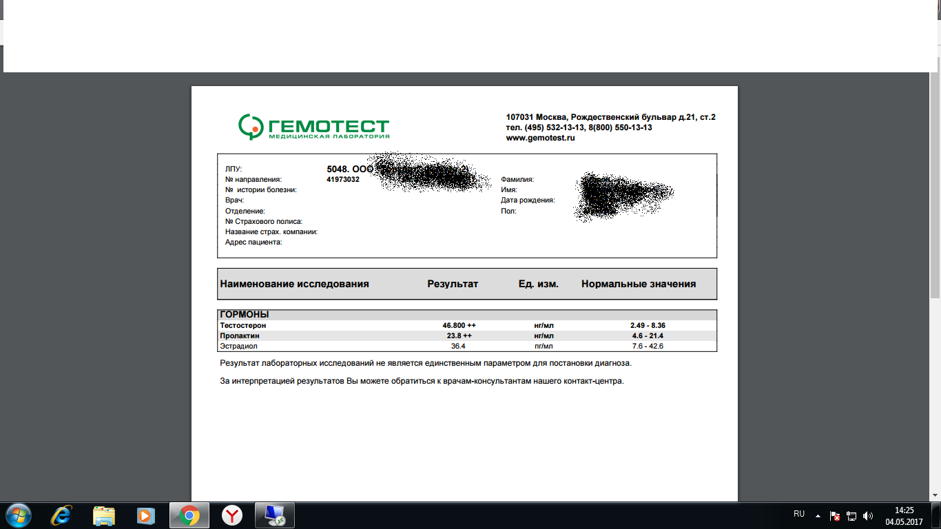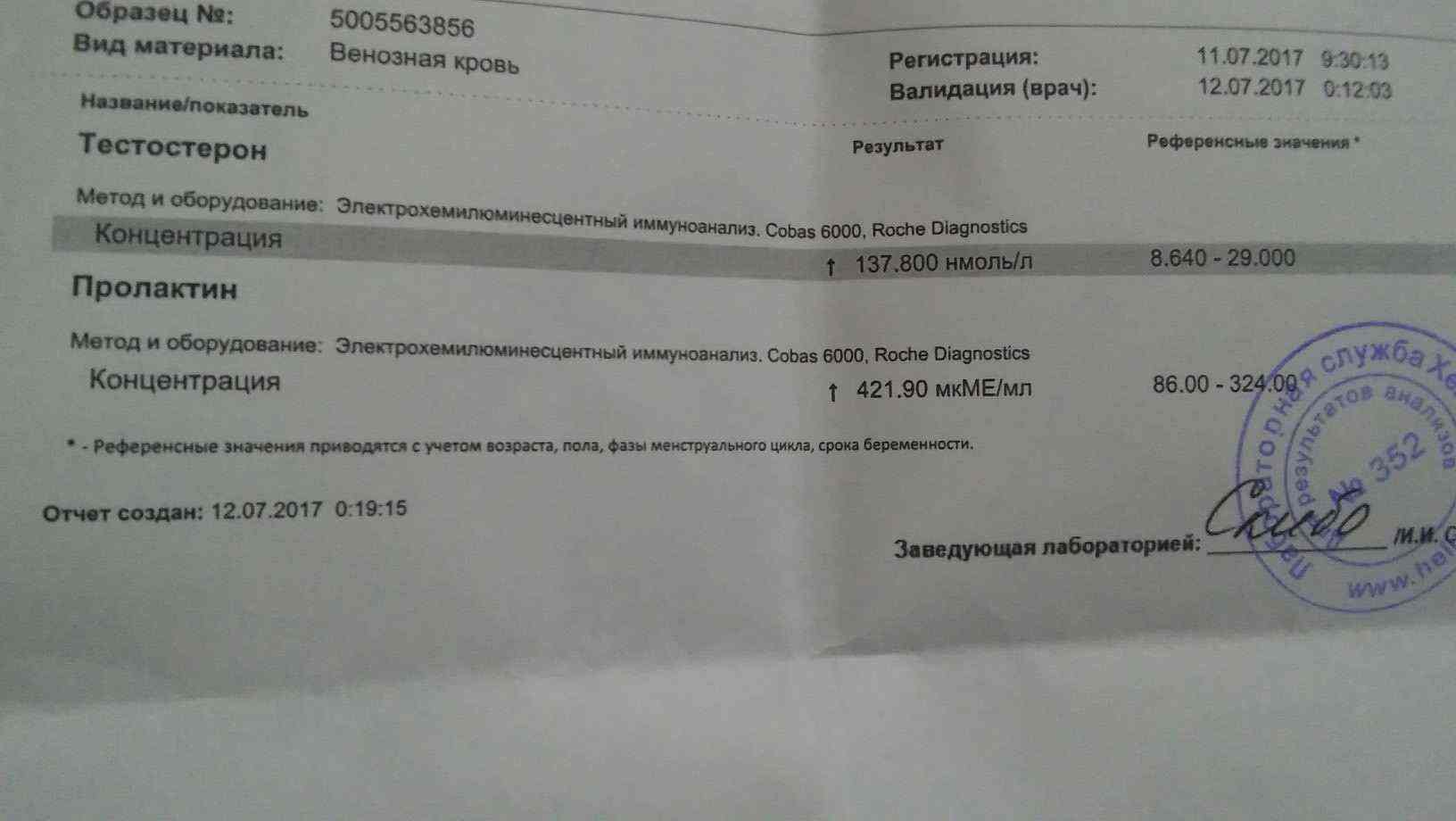 Сегодня сдал анализы (18й день курса), ставлю тп + винс по 100 ч/д + нанфенил 100 на третий. До начала курса сдавал анализы, был завышен немного пролактин, начал принимать берголак и принимаю ег по пол таблетки каждый четвертый день уже дней 20. Вообще вот мои анализы. Очень жаль, что теста показало только 1600 (( Хотелось бы узнать его реальную цифру.