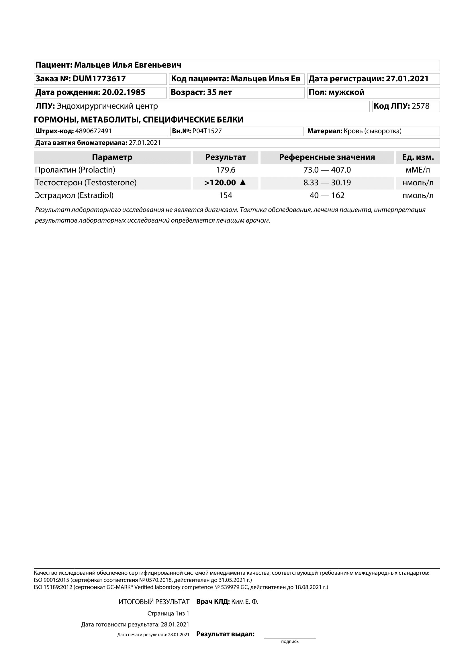Добрый день. Мои результаты анализов по ципионату TESTEX ELMU (аптека). Ставлю по 2 куб. в неделю. Годный продукт!