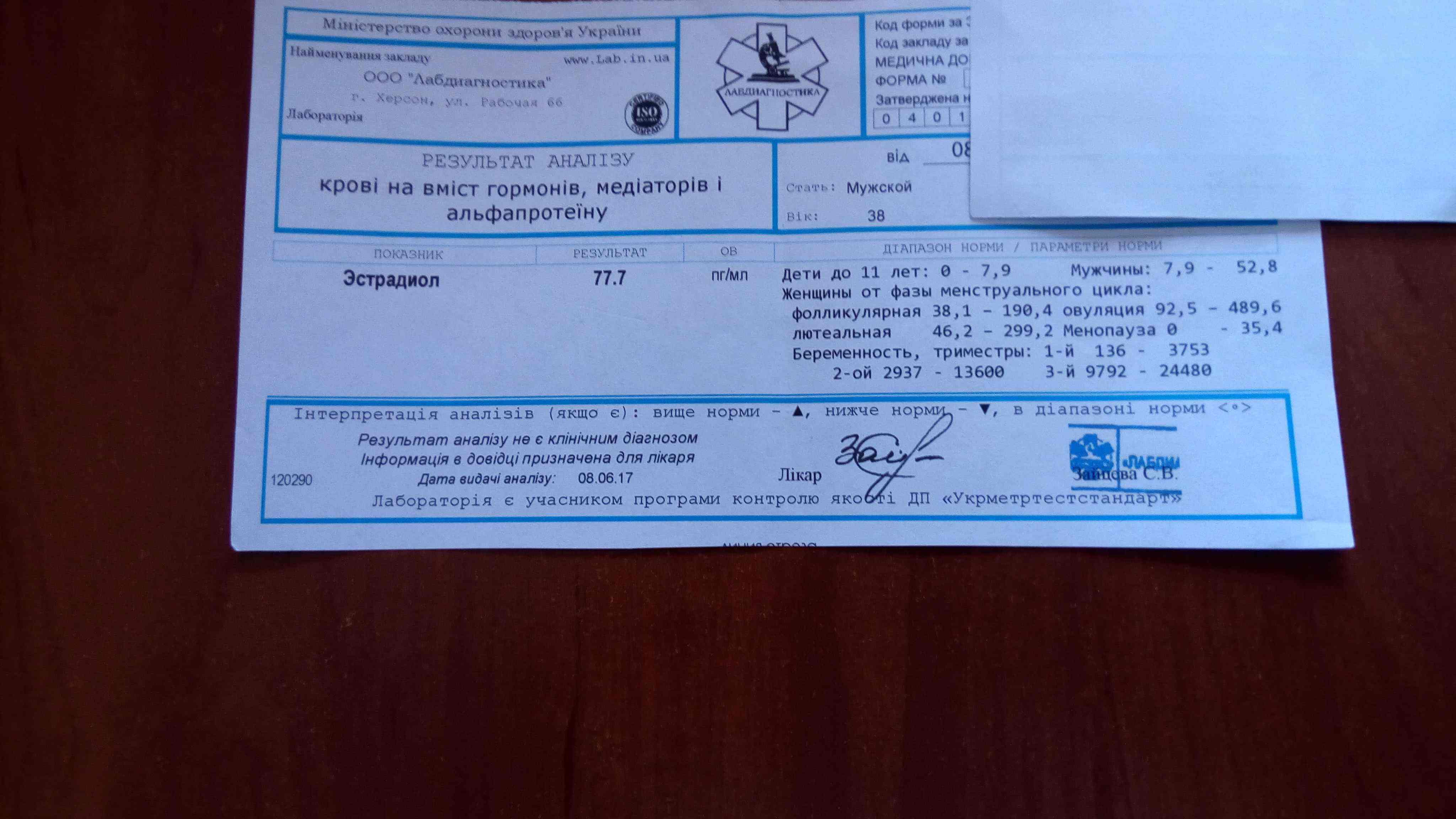 Привет!Начну по-порядку!21 мая,поздно вечером-сделал первый инжект!Первая неделя,то есть 21 и 24,колол 750/300(тест/дека),каждый ижект!28-го-уже разделил,375/300 (тест/дека)и 31-го 375(тест)!С 26-го,начал принимать анастразол 1т/через день!С 27-го-каберголин 0.25 мг,и 7-го,вторую 0.25 мг принял,получается раз в десять дней!8-го,сдал анализы,часов через 13,после инжекта теста!Сдавал тест(общ),эстрадиол,пролактин!Сегодня должны были отдать все анализы,но лаба подвела с тестом!Пришли только,эстрадиол и пролактин!Я думаю для корректировки,они как раз и сгодятся!Вот анализы!Жду совета!