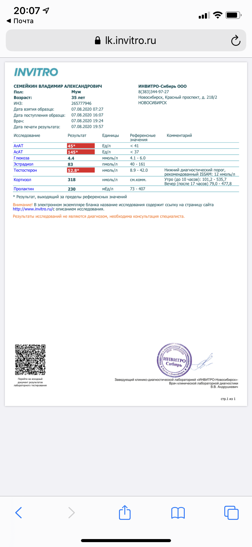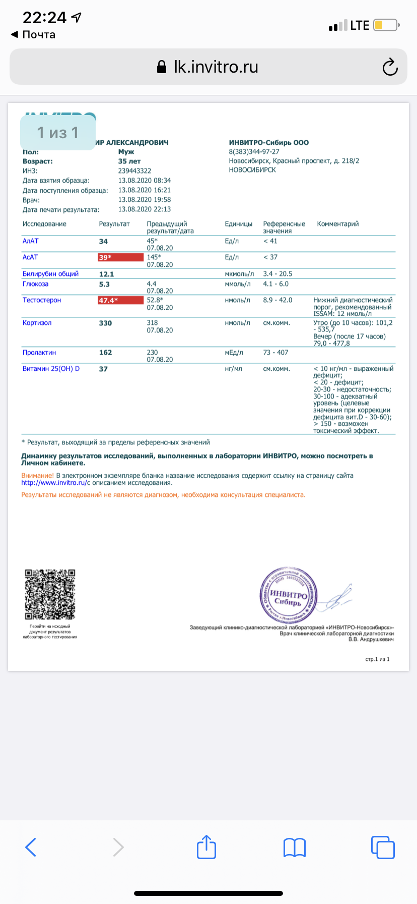 В целом 250 мг это небольшая доза и твой тест сейчас немного выше референсов, результат какой-нибудь да будет ))) но ты не сдавал свой тест до курса. Может у тебя родной-свой тестостерон 35 единиц это одно -значит повышение от искуственного небольшое, а если твой родной 15 единиц, а сейчас 50, ну сам понимаешь разница какая...